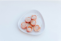 将扇贝卷在培根内,用牙签稍作固定,培根长短宽窄根据扇贝的大小需要做一下切边处理,定型后双面撒黑胡椒备用