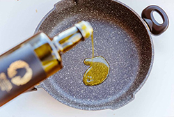 取一口不粘锅,烧至冒烟后转小火,倒入橄榄油