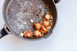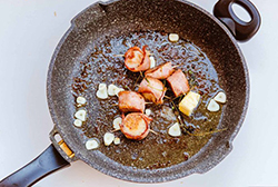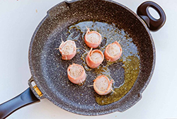 将锅子倾斜,尽量让食材全部粘满锅中的酱汁,并用勺子将酱汁不停的淋在扇贝卷上,各面都煎好后出锅备用
