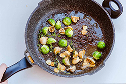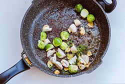 用锅中的余油煎蔬菜,放入口蘑与抱子甘蓝,香草