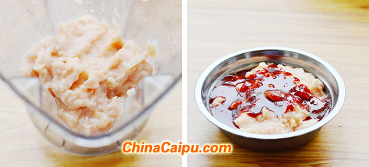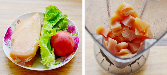 14:鸡胸肉一半用搅拌机。