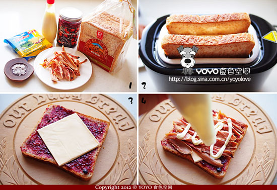 食材:嘉顿幼麦方包,果酱、乳酪、熟鸡肉碎、低卡沙拉酱、海盐