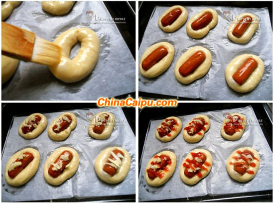 14.将肠仔放在面团的中间;