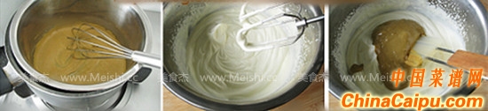 4.隔80°C热水打发至浓稠,然后隔冰水搅拌至冷却