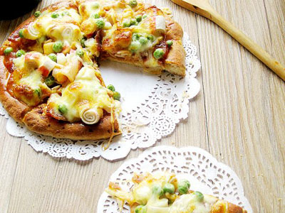 辅料: 马苏里拉芝士碎适量 披萨酱适量 培根适量 豌豆适量 蟹足棒适量