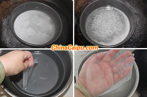 12、吃的时候将拉皮从水中取出切成宽条,放入备好的各种丝、炒好的肉丝和兑好的调料汁,再放入少许盐拌匀就可以吃了;在饭店吃或者做宴客菜,就将所有的丝垫底,上面放拉皮,炒好的肉丝放到拉皮上,再浇上调料汁,吃的时候再拌匀就可以了。