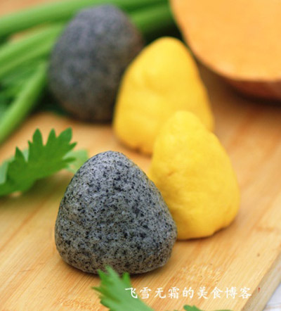 1、蒸熟的南瓜泥放凉加入中筋面粉和酵母混合成团,发酵至二倍大。黑芝麻粉加入中筋面粉,酵母,白糖和水混合成团,也发酵至二倍大。(因为各地区的南瓜品质不一样,可能南瓜的份量会有所增减,以能揉成团为好)