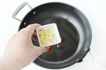 2.锅中加入一汤勺色拉油,小火炒香干红辣椒与八角,然后加入姜丝与蒜片。加入酸菜翻炒均匀后加入生抽,盐糖翻炒2分钟,加入家乐复合汤料(没有用高汤或清水)清水转大火烧开。
