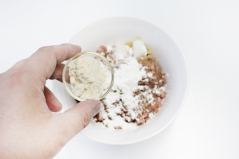 1.选择瘦肉与猪肉比例7:3的猪绞肉,一次加入所有姜粉、葱水、酱油、盐巴、五香粉等调味料拌匀搅打上劲后待用。