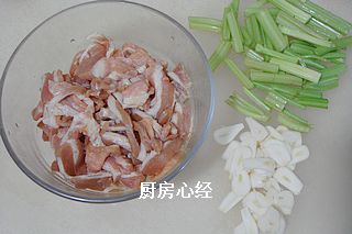 4.锅中放油爆香蒜片;芹菜然后倒入肉片,调入盐2克;酱油5克;料酒5克;鸡精3克;炒匀后出锅。