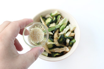 3.洗干净的干菜装入容器中,加入生抽,生抽的量没过干菜为佳,然后加入芝麻油拌匀,浸24小时即可食用,吃前撒少许白芝麻即可。