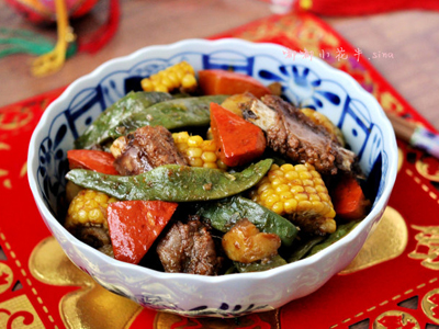 东北花皮豆角200克、土豆2小个、玉米半根、南瓜1/4个、精排骨8—10块、大葱1/3根