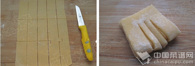 5、如果觉得翻花麻烦,可以将面片切割成适当大小的三角形面片直接下锅炸更省事。