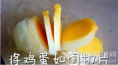 将滑溜溜的鸡蛋直接切片,如果刀工好的话,切出均匀的七个甚至更多薄片,对一个鸡蛋来说显然是没有问题的。