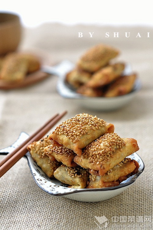 脆皮年糕,由馄饨皮包裹年糕,再放到油锅里炸一下,出锅后的脆皮年糕,香脆可口,美味十足,轻轻的咬一口,又脆又酥。