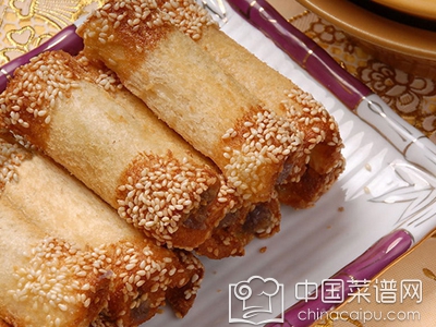4.擀面杖将糯米粉团擀成几张长圆形面皮,鹅油里放白糖(适中),均匀刷在面皮上,然后将一个个松瓤均匀嵌在面皮上,卷起.卷的过程中,一边卷一边在卷上去的面皮另一面刷鹅油直到卷好为止.