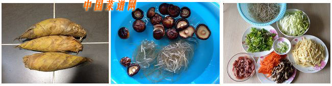 1、冬笋剥壳后冷水入锅煮约20分钟,香菇和粉条冷水泡发,所有主材切粗细均匀的丝,肉丝可按自己喜欢腌制或者不腌制也行。