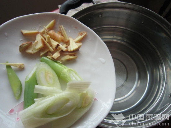 2.锅中放足清水,加入生姜和大葱大火烧开