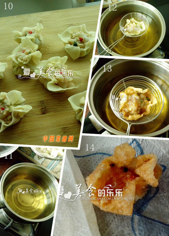 12.把做好的半成品放在一个漏勺中,放入锅中小火炸。