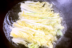 锅中放入水烧开放一点点盐和油,将娃娃菜焯一下,不要焯的太久影响口感,营养流失