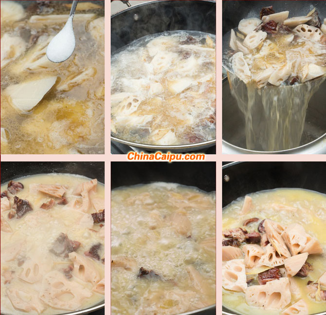 2、锅烧热去油,倒入姜片小火煸香,倒入腊鸡煸炒,炒出浸泡入的水分,炒出腊鸡的香味后加入适量的水淹过腊鸡,加入胡椒碎、倒入莲藕;