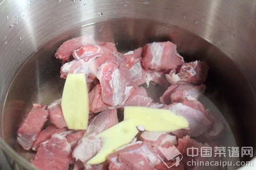 3.将牛肉冷水下锅焯一下,焯水的时候,往锅里放入一半的姜片、料酒,放姜和料酒可起到去腥的作用,焯好后捞出牛肉备用