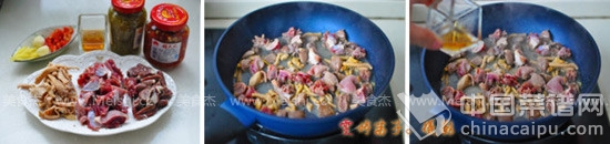 4.平底不粘锅中倒入适量油,爆香姜片、蒜片,依次放入鸡胗、心、肝,最后翻炒鸡肠,接着倒入黄酒去腥