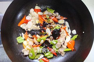 4.这时倒入瘦肉片,炒匀后倒入少许的清水,收尽之后,即可出锅。