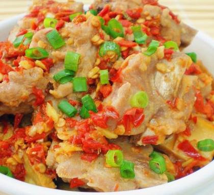 3.取一个耐热的大碗,将腊干子铺在碗底,再放上腌制好的排骨,撒上姜蒜末,浇上适量的剁辣椒;