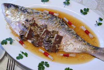3、将鱼放入开水中去腥味,鱼鳞朝上放盘中,火腿片、香菇片、猪网油、笋片相间铺放在鱼身上,加入鸡清汤和调料旺火蒸20分钟取出,拣去网油,汤汁滗入碗中,加胡椒粉调匀,浇在鱼身上,放上香菜即成。