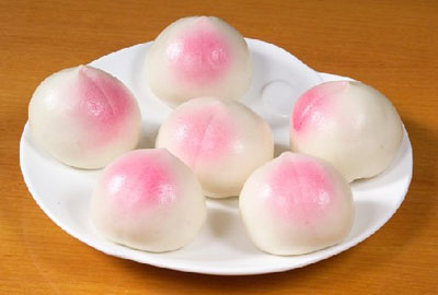 制法:发酵面取30g面团做叶柄用,其余面团摘成10只剂子,包入馅心10g,捏紧收口向下放,上端搓出一个桃尖略向一边倾斜,再用刀背在桃身至桃尖处压出一道凹槽,然后用面团制成二瓣叶子和桃柄装上,即成寿桃包子,上笼蒸12分钟至熟,成熟后,用方刷分别沾色素溶液将桃身喷成黄色,将桃尖喷上淡红色,将桃叶喷上淡绿色。