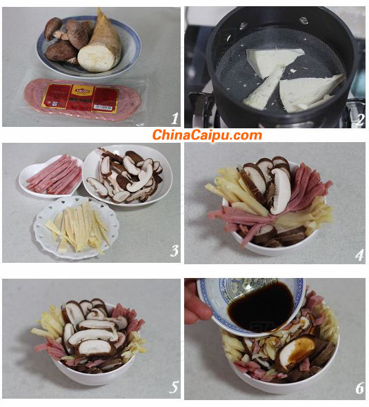 3, 冬笋切丝,香菇洗净后去根蒂切薄片,火腿片切丝。