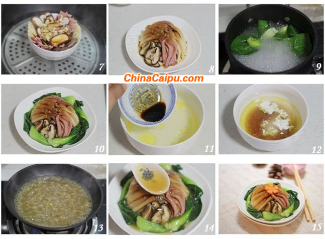 9, 青菜洗净后放入烧开的水中,加几滴食用油,焯煮10秒后捞出,沥干水分。