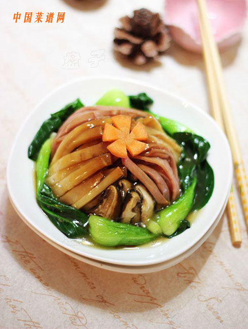 原料:冬笋1个,新鲜香菇4朵,火腿4片。