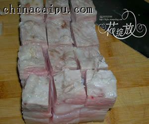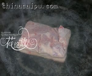 1、五花肉整理干净后放沸水锅中煮约十分钟,其间打去浮沫。