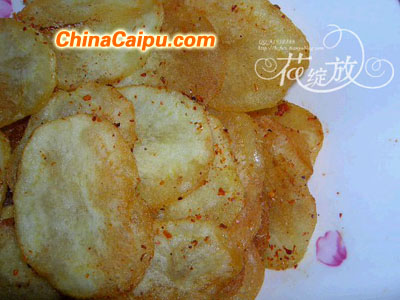 1、土豆两个,切极薄的片,用清水冲洗净表面的淀粉后沥干水份。2、辣椒粉一大匙(可依个人喜好增减)。3、花椒粉半咖啡匙。4、盐、味精适量。
