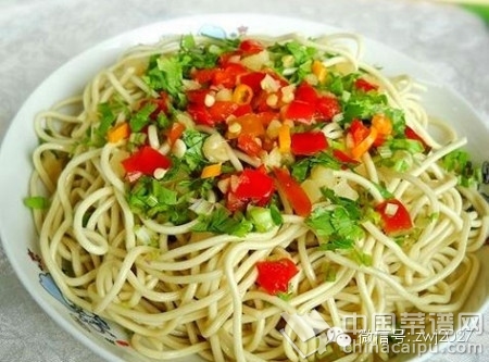 5、用生抽,陈醋,糖,蕃茄酱,柠檬汁,凉开水,辣椒红油,芝麻香油,生蒜蓉,红椒圈,香菜碎在 碗内调匀即成凉面料汁。