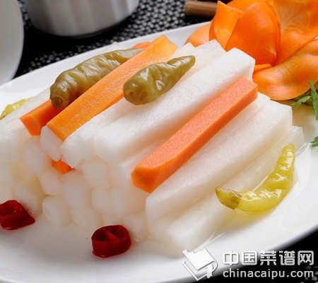 4、将白菜心和萝卜切成细丝,加醋、糖拌匀后食用,清凉解酒。