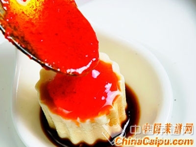 3、取一整块南豆腐,用模子切成块,装入容器中,在每块豆腐上淋适量酱油,再取适量酸辣酱放在豆腐上。