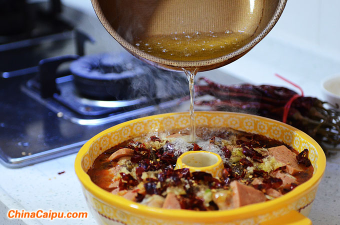 水煮烹饪方式的最后一步:在出锅的菜上淋上一层滚烫的热油,这个步骤也是水煮之其二,二的很重要。。油与蒜蓉、辣椒粉、花椒粉击撞的精妙瞬间伴随着“刺啦”一声,开场亦结束。无论视觉、听觉还是味觉,都被那激扬的气场瞬间感染,难以克制饕餮的欲望来袭。那层油不仅用来“耍帅”,也用来御寒,拖住时间的脚步,延缓冷却。当然,这也是川菜特色的一大表现。