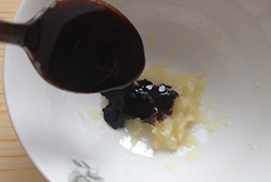 6 大蒜用刀拍扁后,再放到碗里用擀面杖捣成蒜泥