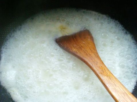 2、少量下油,炒面粉至微黄,加入开水煮沸即成奶汤。然后放入冬菇、火腿或鲜虾仁,最后放入蒲菜开锅,盛入汤碗中即可。