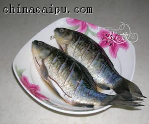 1、鲫鱼去鳞去鳃剖肚去肠整理干净,用刀在鱼身两面划几刀,放盐、料酒腌二十分钟以上。