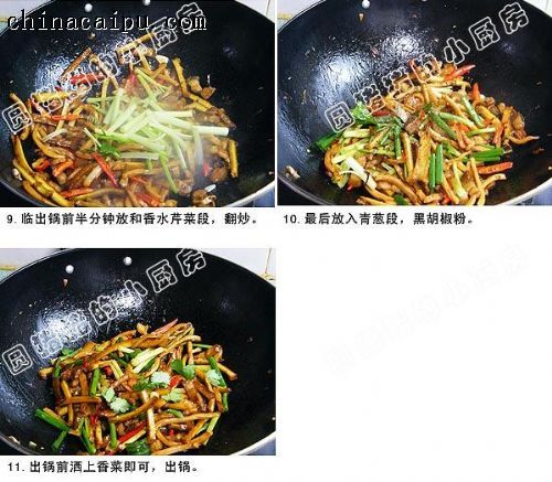 材料:五花肉150克 水发鱿鱼 95克 五香豆干 2块 香葱 适量 香水芹菜 适量 小朝天红椒 4 个